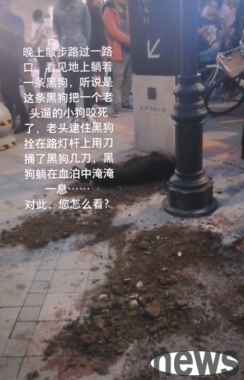 A big dog killed an unleashed Teddy, and its owner hacked the big dog to death with a knife. Witness: The scene was very vicious