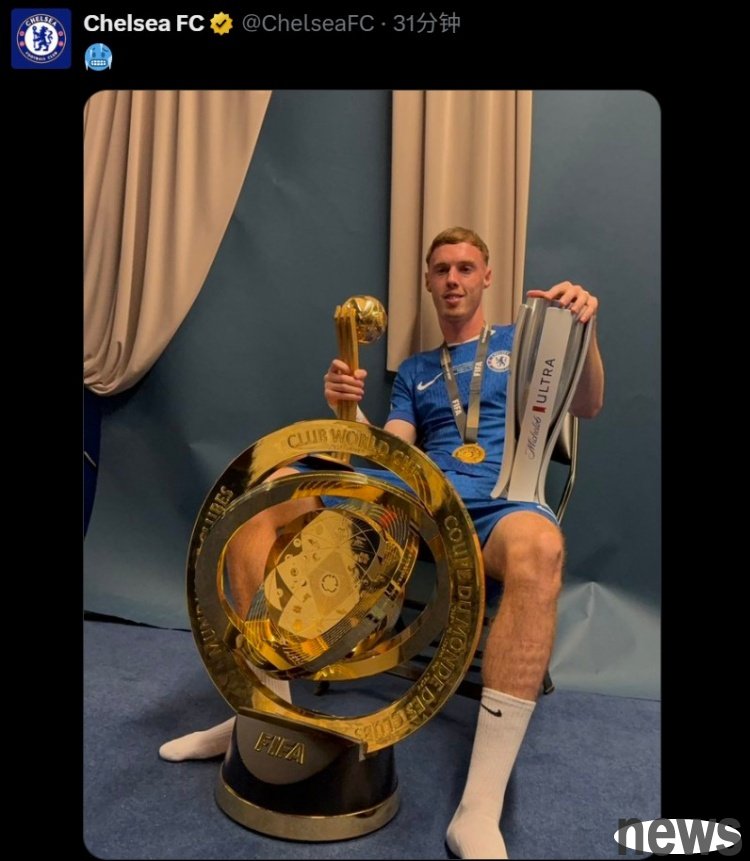 Chelsea official posted Palmer's post-match photos with a "cold" expression. Palmer holds the Club World Cup Golden Globe Award and the Club World Cup Finals Best Player Award in both hands, and in front of him is the heavy Club World Cup trophy.