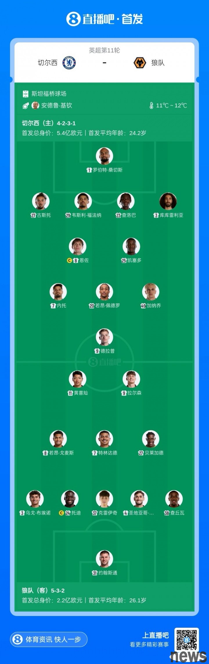 In the 11th round of the Premier League, Chelsea faced Wolves, and the starting lineup was announced before the game.