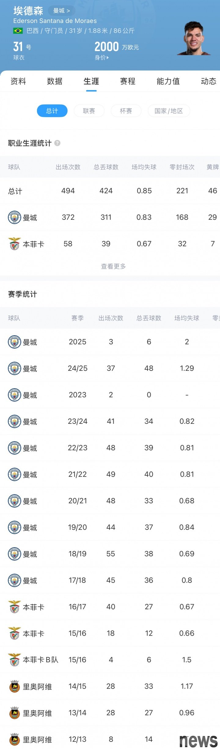 Ederson is 31 years old and has played for Manchester City for 8 seasons and has made a total of 372 appearances.