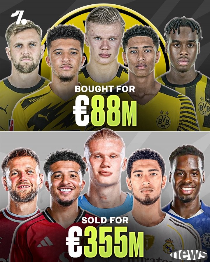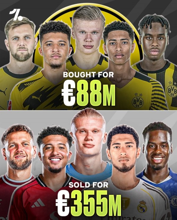 Onefootball listed a series of excellent operations by Dortmund in the transfer market in recent years, spending 88 million euros to sign 5 players including Haaland, Sancho, and Bellingham, and selling them for a total of 355 million euros.