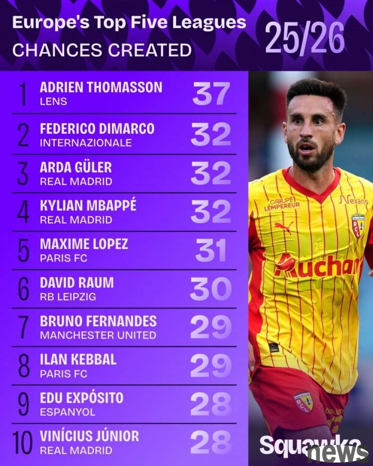 The war in the five major leagues is about to resume. The data agency squakwa also calculated the number of opportunities created by players in the five major leagues so far this season. Lens midfielder Adrian Thomason topped the list.