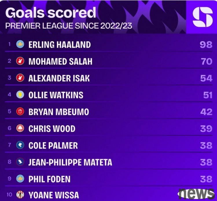 Premier League scorer list since 2022-23 season: Haaland ranks first with 98 goals, followed by Salah with 70 goals