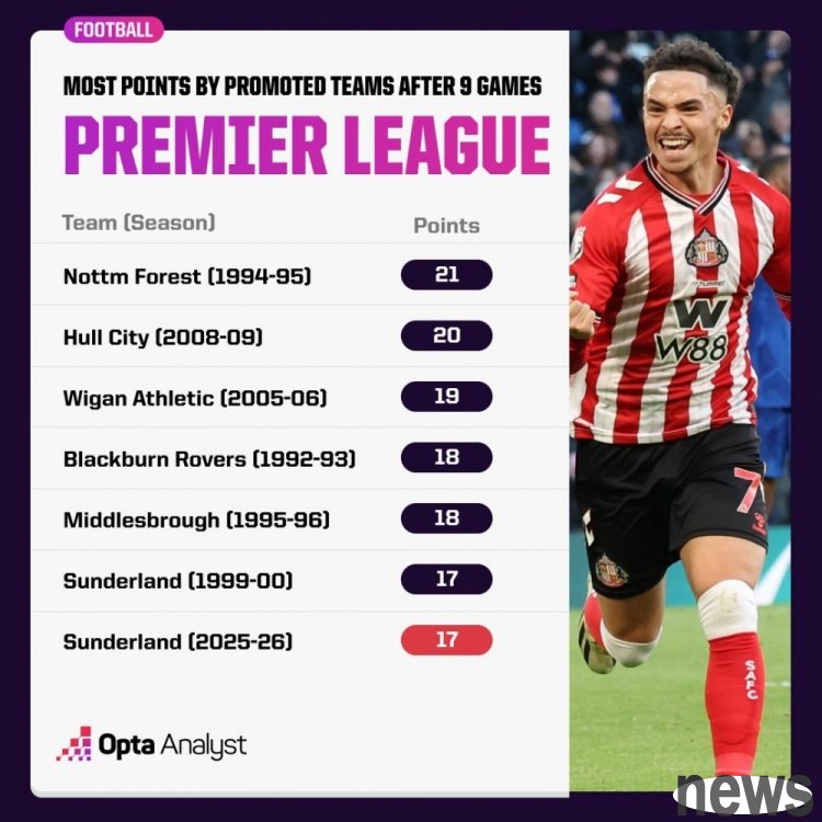 Sunderland scored 17 points in the first 9 rounds of the league! Ranked tied for 6th among newly promoted teams in Premier League history during the same period