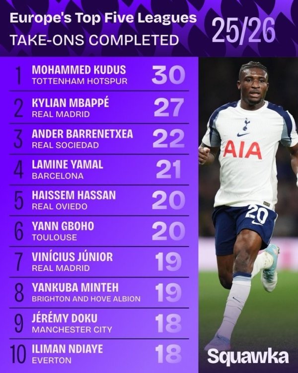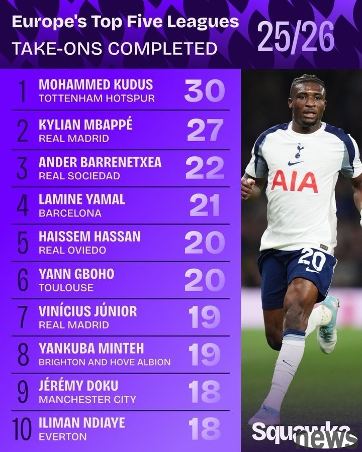According to statistics from the five major European leagues this season, Tottenham player Kudus leads the data list with 30 successful dribbles, followed by Real Madrid forward Mbappe with 27 times.